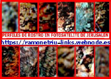 Creo que ha de interesar el hecho constatado por mi (gracias a las fotos publicadas gentilmente en internet por Google Earth), de que al entorno de las zonas donde se ubican los principales lugares sagrados del mundo, se descubren perfiles de rostros, llegando a mezclarse unos con otros. Daré muestras de lo dicho, incluyendo sólo fotos de los alrededores de Jerusalén (Israel-Palestina), y de la sierra de Montserrat (Cataluña-España).